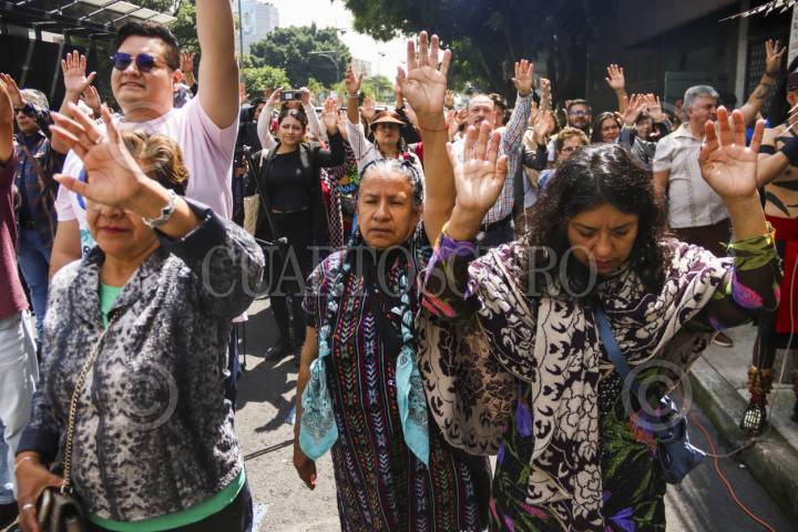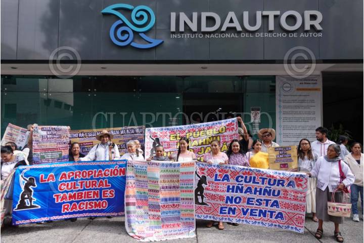 CIUDAD DE MÉXICO, 06JUNIO2025.- Indígenas otomíes de diferentes municipios del Valle del Mezquital, en Hidalgo, exigieron justicia y reparación del daño por la apropiación de sus diseños culturales afuera del Instituto Nacional del Derecho del Autor (INDAUTOR). FOTO: GRACIELA LÓPEZ/CUARTOSCURO.COM