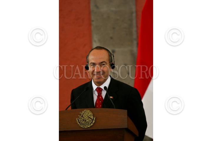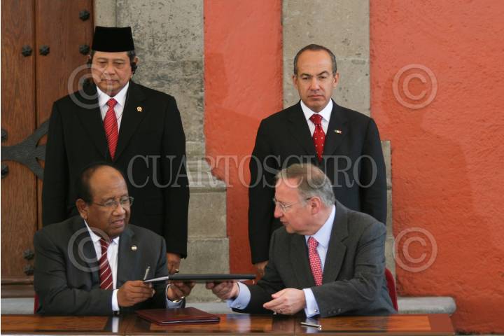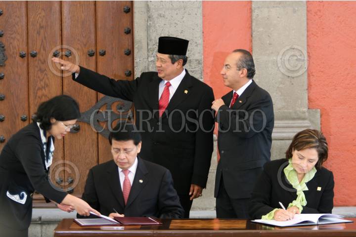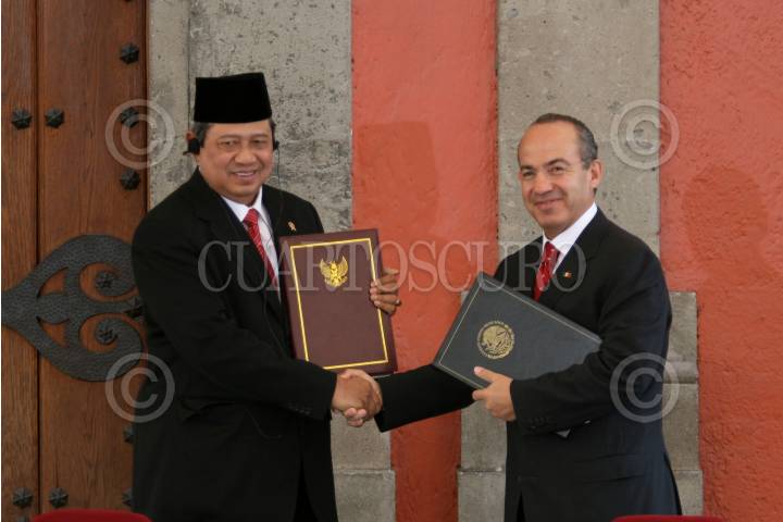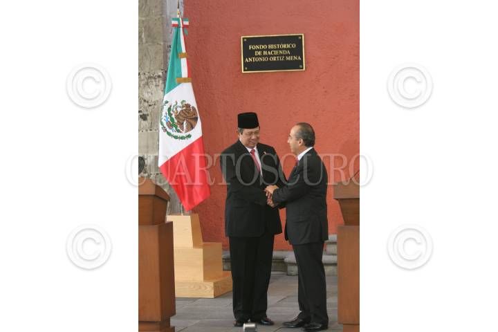 MÉXICO D.F., 17NOVIEMBRE2008.- El presidente, Felipe Calderón Hinojosa, acompañado de Susilo Bambag Yudhoyono, presidente de la República de Indonesia, fueron testigos de honor de la firma de convenios de colaboración entre diversas dependencias de ambos países, esto en la escalinata de la Biblioteca del Fondo Histórico de la Ex Hacienda en Palacio Nacional. FOTO: GUILLERMO PEREA/ CUARTOSCURO.COM
