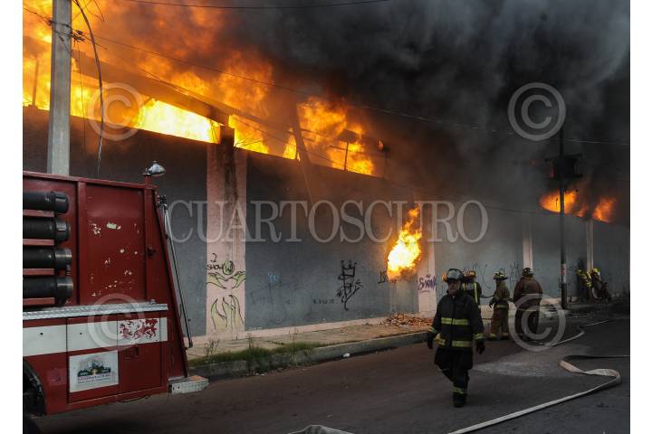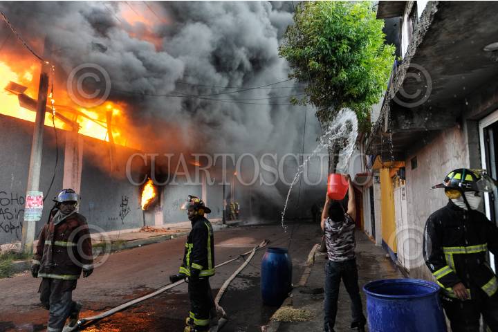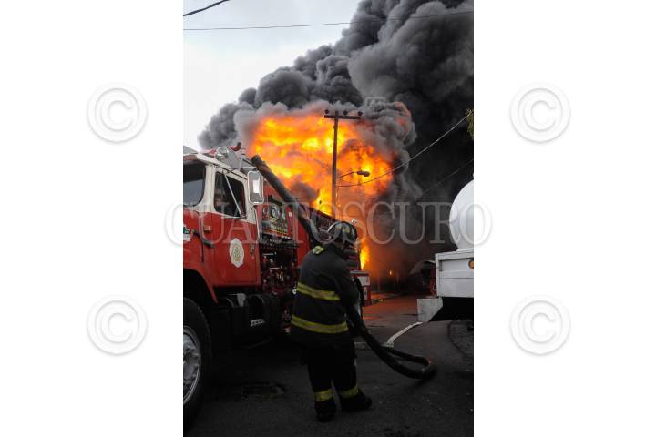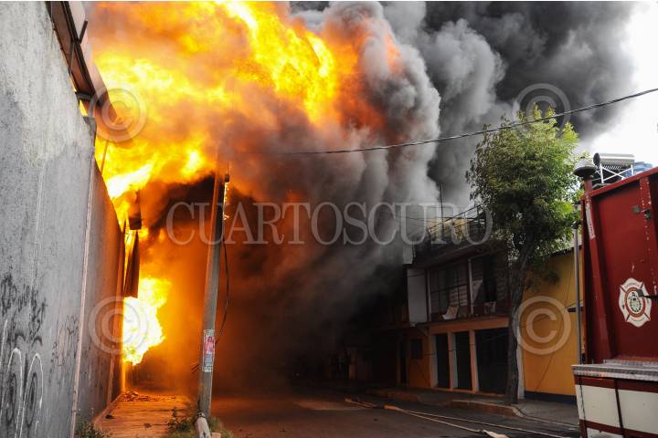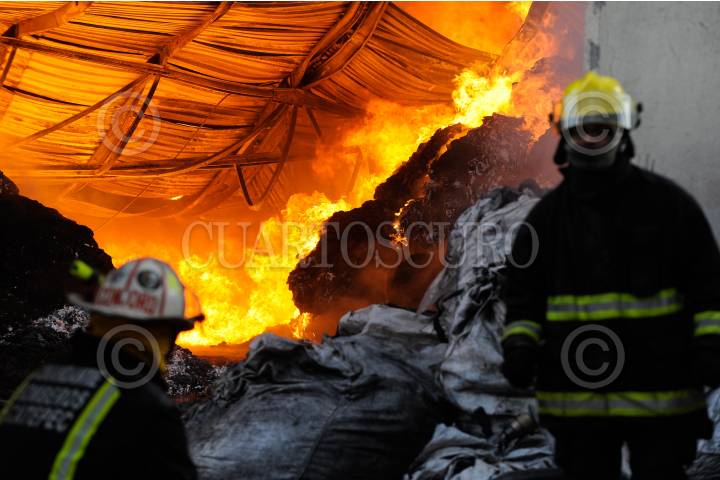 ECATEPEC, EDO. MEX., 16AGOSTO2015.- Toneladas de Plástico quedaron en cenizas al registrarse un fuerte incendio en una Recicladora de materiales industriales, sobre las calles de Hierro y 22 de la Colonia Santa Maria Xalostoc, bomberos de varios Municipios llegaron al lugar del siniestro apoyar con agua. FOTO: ARMANDO MONROY /CUARTOSCURO.COM