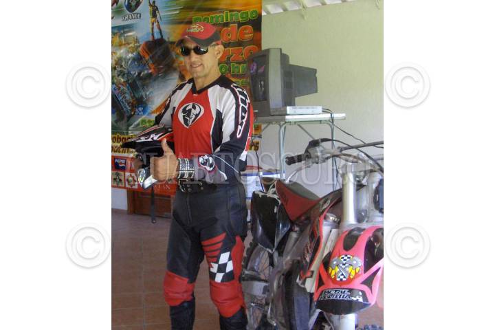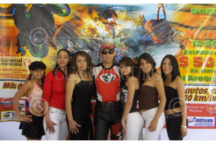 CHILPANCINGO, GUERRERO 01MARZO2006.- Marcelo Gonzalez Raquetti piloto-acrobata en motocicleta acompañado de bellas edecanes, posan para los fotografos, al termino de la conferencia, donde se anuncio el espectaculo "Pilotos Infernales de Francia", el cual se presentará el próximo fin de semana en Chilpancingo. FOTO: Oscar Alvarado/CUARTOSCURO.COM