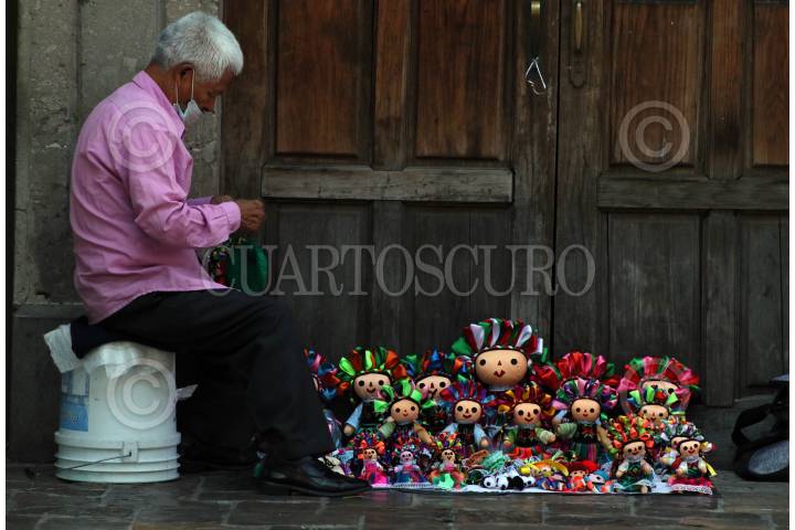 Un hombre vende muñecas otomíes en el centro de la ciudad.