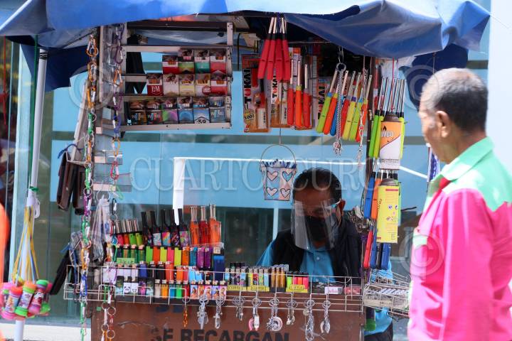 Un hombre atiende su negocio de venta de encendedores en el centro de la ciudad.