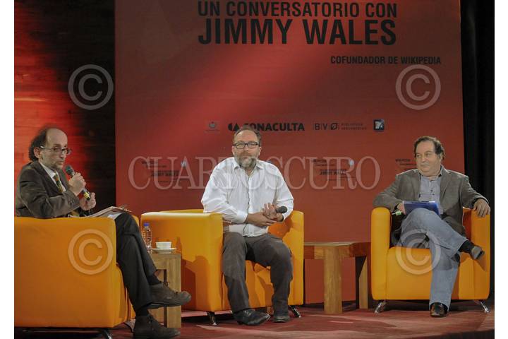 MÉXICO, D.F., 16JULIO2015.- Ayer por la tarde, Jimmy Wales, cofundador de Wikipedia, asistió a la charla "El conocimiento libre" en el Auditorio de la Biblioteca Vasconcelos. En la imagen, Daniel Goldin, Jimmy Wales y el periodista José Gordon. FOTO: ARTURO LÓPEZ /CNCA /CUARTOSCURO.COM