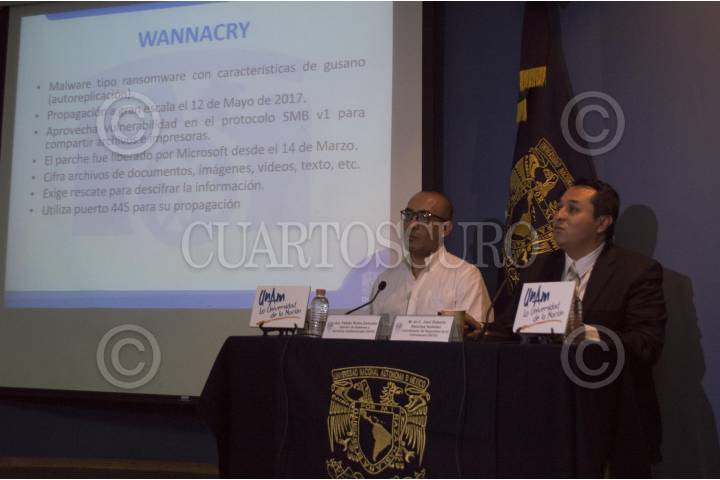 CIUDAD DE MÉXICO, 17MAYO2017.- Fabian Romo Zamudio, director de Sistemas y Servicios Institucionales de la Dirección General de Cómputo y Tecnologías de la Información y Comunicación (DGCTIC) de la Universidad Nacional Autonóma de México (UNAM), y Roberto Sánchez Soledad, coordinador de Seguridad de la Información de la DGCTIC, informaron sobre el ciberataque masivo por el virus informático "wannacry" ocurrido el pasado 12 de mayo a nivel mundial, en el que fueron afectadas más de 300 mil computadoras. Ante esto los expertos en el tema recomendaron actualizar los sistemas operativos de las computadoras, así como, evitar el pago a cambio de la recuperación de la información. FOTO: SELENE PACHECO /CUARTOSCURO.COM