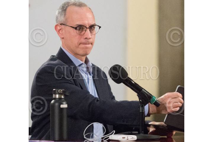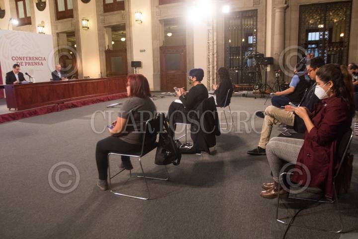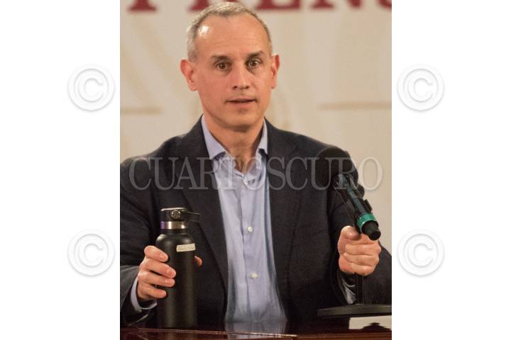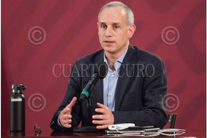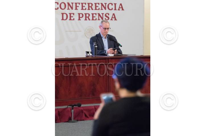 Hugo López Gatell, de promoción de la salud, durante el informe y conferencia sobre la pandemia del Covid 19, en el salón Tesorería de Palacio Nacional. Lo acompaña el médico, José Luis Alomía.
