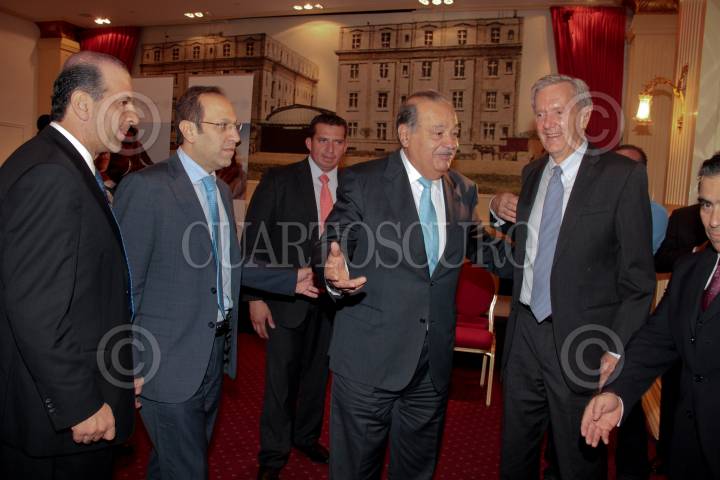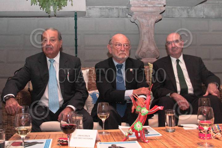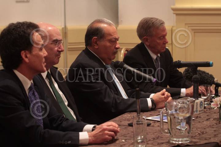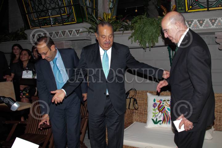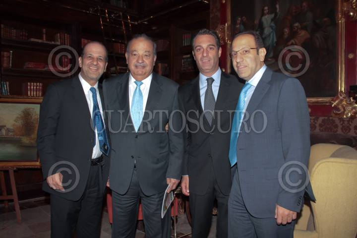 MÉXICO, D.F. 02OCTUBRE2013.- El empresario Carlos Slim posa con sus hijos Carlos, presidente del Consejo de Administración de Grupo Carso y vicepresidente del Consejo de América Móvil; Marco Antonio, Presidente de Grupo Financiero Inbursa; y Patricio Slim Domit, vicepresidente de Grupo Carso y América Móvil, presidente del Consejo de Administración de Ferrosur, director general en Industrias Nacobre, miembro de los consejos de Carso Global Telecom, Teléfonos de México, Hoteles Calinda, Grupo Condumex, Empresas Frisco, Sears Roebuck de México, Cigarros La Tabacalera Mexicana y Promotora Inbursa. La foto fué tomada después del informe de logros de la Alianza de la WWF (World Wildlife Fund),Semarnat y la Fundación Slim. FOTO: JUAN PABLO ZAMORA /CUARTOSCURO.COM