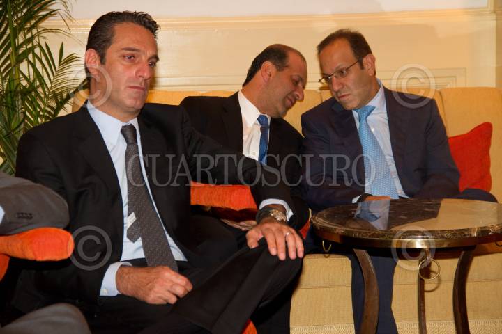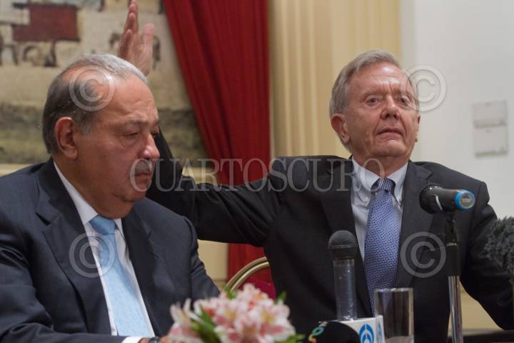 MÉXICO, D.F. 02OCTUBRE2013.- El empresario Carlos Slim, dá el paso al titular de SEMARNAT, Juan José Guerra Abud, durante el informe de logros de la Alianza de la WWF (World Wildlife Fund),Semarnat y la Fundación Slim, tras cumplir 5 años de apoyar estrategias de conservación de la Biodiversidad y el Desarrollo Sustentable de México. A la derecha del ingeniero, su hijo Marco Antonio Slim Domit, Presidente de Grupo Financiero Inbursa. FOTO: JUAN PABLO ZAMORA /CUARTOSCURO.COM