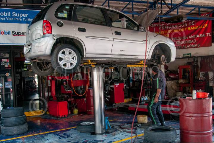 MÉXICO, D.F., 20ABRIL2015.- Un mecánico automotriz trabaja debajo de un auto que fue elevado para una mejor efectividad a la hora de ser reparado. FOTO: DIEGO SIMÓN SÁNCHEZ /CUARTOSCURO.COM