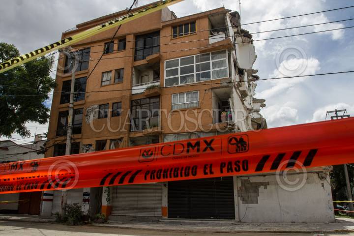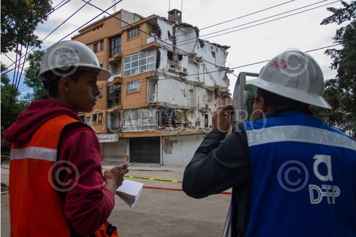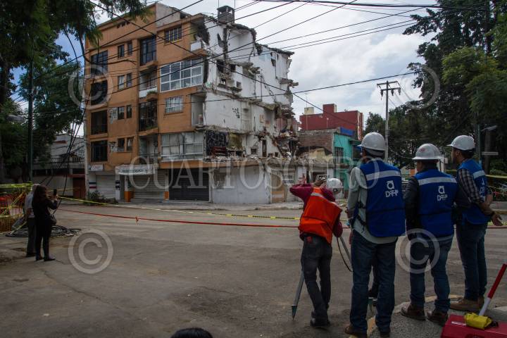 CIUDAD DE MÉXICO, 10OCTUBRE2017.- Ingenieros realizan estudios del edificio dañado en la calle de Concepción Beistegui, para su demolición sin que afecte a otras viviendas. FOTO: ISAAC ESQUIVEL /CUARTOSCURO.COM