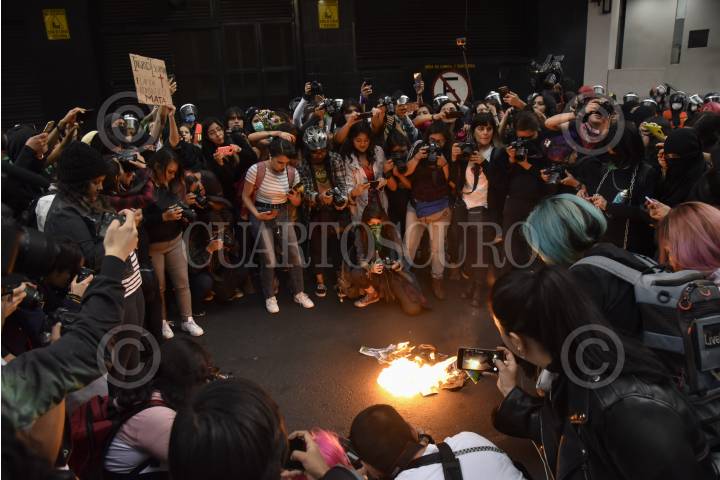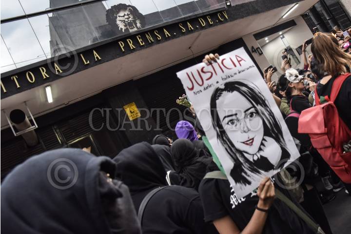 Mujeres de grupos colectivos feminista se manifestaron al exterior de las instalaciones del periódico La Prensa después de la publicación realizada por el feminicidio de Ingrid Escamilla.