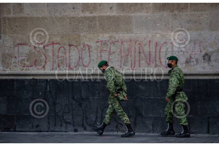 Militares caminan frente al Palacio Nacional en el cual pese a las restauraciones y limpias no se ha podido borrar los vestigios que dejaron las marchas feministas pasadas por los miles de feminicidios que azotan al país