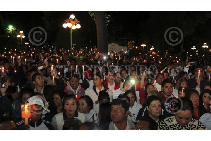 TLAXCALA, TLAXCALA, 04ABRIL2016.- La parte frontal del Palacio de Gobierno en la capital del estado se vio iluminada por cientos de velas y veladoras en un ritual que encabezó la abanderada del PRD a la gubernatura de Tlaxcala y senadora con licencia, Lorena Cuéllar Cisneros. En el primer minuto de este lunes, cientos de simpatizantes de la abanderada y militantes perredistas se dieron cita frente a Palacio de Gobierno. También llegaron de los municipios, maestros, seguidores y su equipo de trabajo. La animación con porras marcó el inicio de esta campaña. FOTO: JORGE LEZAMA /CUARTOSCURO.COM