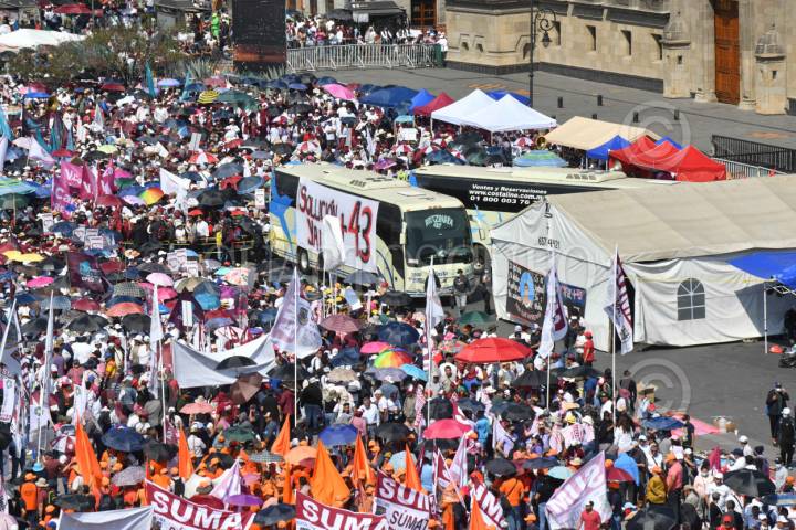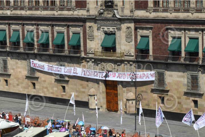 CIUDAD DE MÉXICO, 01MARZO2024.- Campamento por la desaparición de los 43 estudiantes se mantiene frente a la Palacio Nacional previo al inicio de la campaña de Claudia Sheinbaum, precandidata a la presidencia de la República por la alianza "Sigamos Haciendo Historia". FOTO: MARIO JASSO/CUARTOSCURO.COM