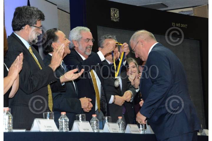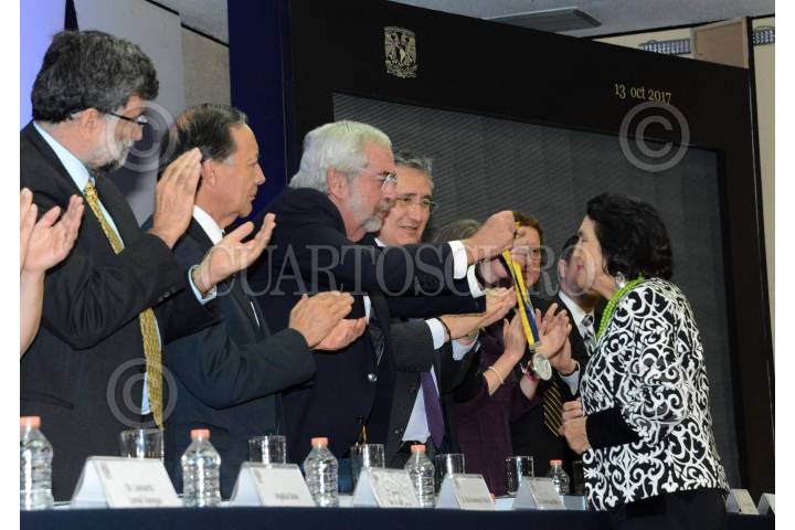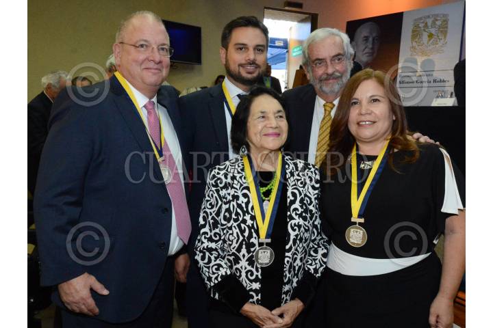 CIUDAD DE MÉXICO, 13OCTUBRE2017.- Eric Garcetti, Dolores Huerta, Kalman D. Resnick, Angélica Salas y la American Civil Liberties Union, recibieron de manos del rector de la UNAM, Enrique Graue, la condecoración Alfonso García Robles, para labores destacadas en favor de personas migrantes. FOTO: UNAM /CUARTOSCURO.COM