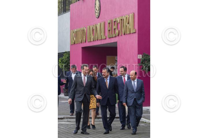 CIUDAD DE MÉXICO, 10OCTUBRE2018.- Gerardo E. García, comisionado del Instituto Nacional de Migración, Lorenzo Córdova Vianelo, consejero presidente del Instituto Nacional Electoral, y el consejero Enrique Andrade González, durante la firma del convenio de colaboración entre el INM y el INE. FOTO: ISAAC ESQUIVEL /CUARTOSCURO.COM