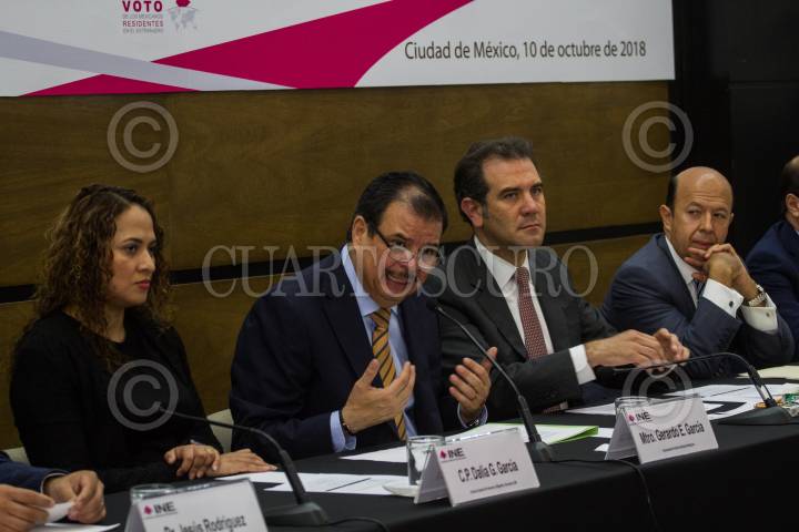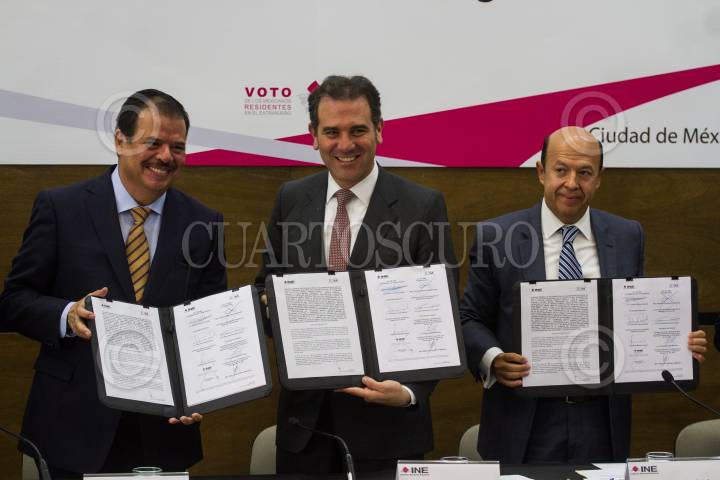 CIUDAD DE MÉXICO, 10OCTUBRE2018.- Lorenzo Córdova Vianelo, consejero presidente del Instituto Nacional Electoral, Gerardo E. García, comisionado del Instituto Nacional de Migración, y el consejero Enrique Andrade González, durante la firma del convenio de colaboración entre el INM y el INE. FOTO: ISAAC ESQUIVEL /CUARTOSCURO.COM