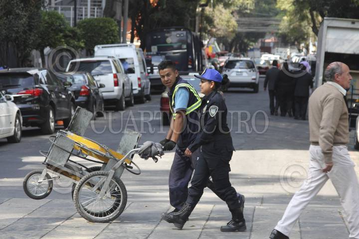 MÉXICO, D.F., 09ENERO2014.- Una mujer policía de la SSP-DF acompañan a un trabajador de la empresa Ecoparq para colocar inmolizadores en automóviles que se encuentran mal estacionados. FOTO: SAÚL LÓPEZ /CUARTOSCURO.COM
