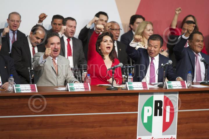 MÉXICO, D.F., 04MARZO2015.- Emilio Gamboa Patrón, líder de los senadores del PRI; Ivonne Ortega Pacheco, secretaria general del PRI; y César Camacho, presidente nacional del PRI; encabezaron los festejos por el 86 Aniversario del PRI donde le tomaron protesta a los candidatos y candidatas a cargos de elección popular. FOTO: IVÁN STEPHENS /CUARTOSCURO.COM
