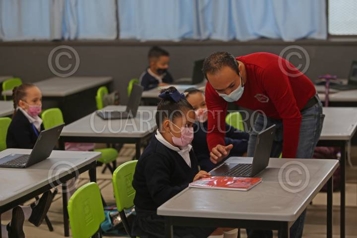 Un profesor de la Escuela Primaria 208 “24 de Febrero”, apoya a uno de sus alumnos con una actividad, esto durante el regreso a clases presenciales en Jalisco.