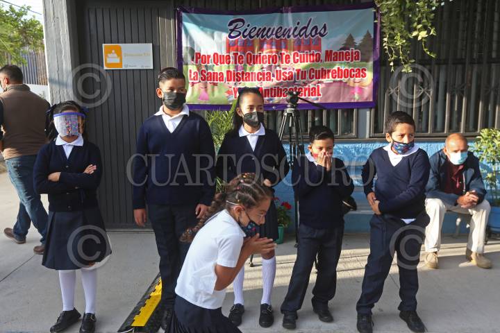 Alumnas de la Escuela Primaria 208 “24 de Febrero”, esperan a que den comienzo las clases en su escuela, esto durante el regreso a clases presenciales en Jalisco.