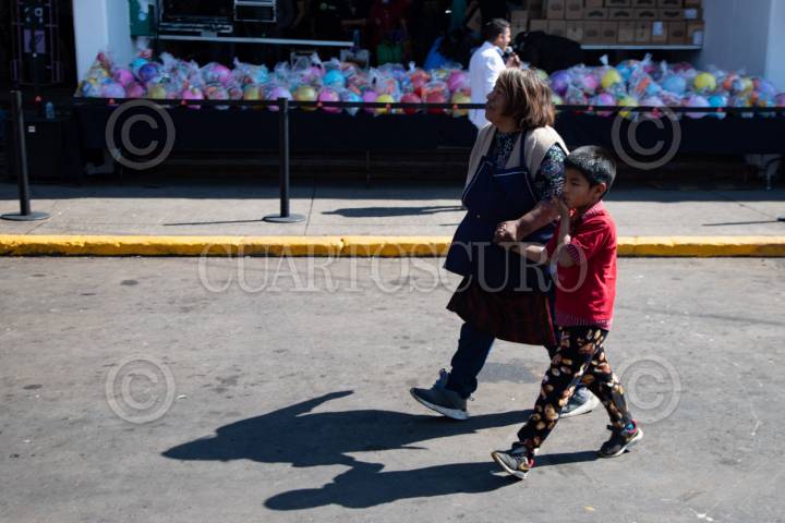 Una mujer acompaña a su hijo a la entregan juguetes a niños de distintas instituciones y de trabajadores de la Central de Abastos de la Ciudad de México, por los festejos de Día de Reyes.