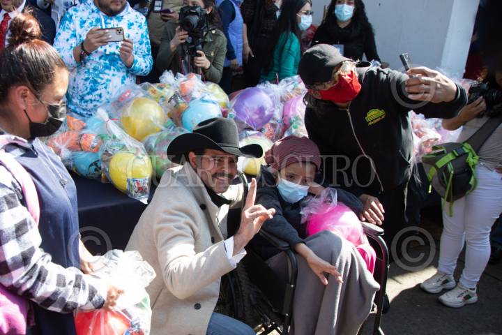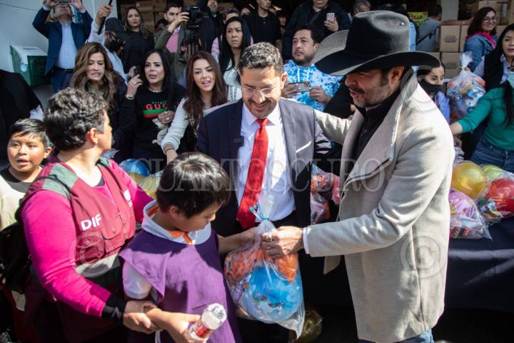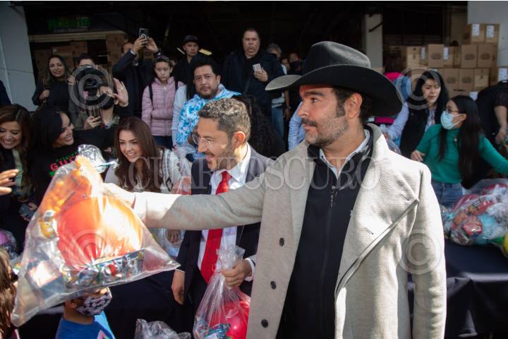El Secretario de Gobierno de la Ciudad de México, Martí Batres y el cantante Pablo Montero durante la entregan juguetes a niños de distintas instituciones y de trabajadores de la Central de Abastos de la Ciudad de México, por los festejos de Día de R