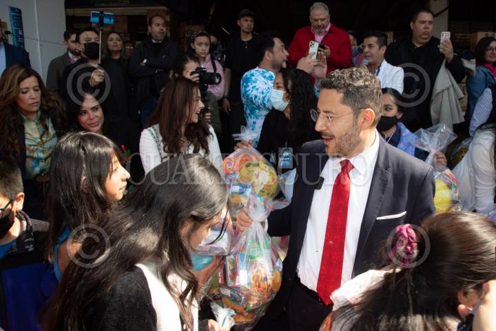 El Secretario de Gobierno de la Ciudad de México, Martí Batres durante la entregan juguetes a niños de distintas instituciones y de trabajadores de la Central de Abastos de la Ciudad de México, por los festejos de Día de Reyes.