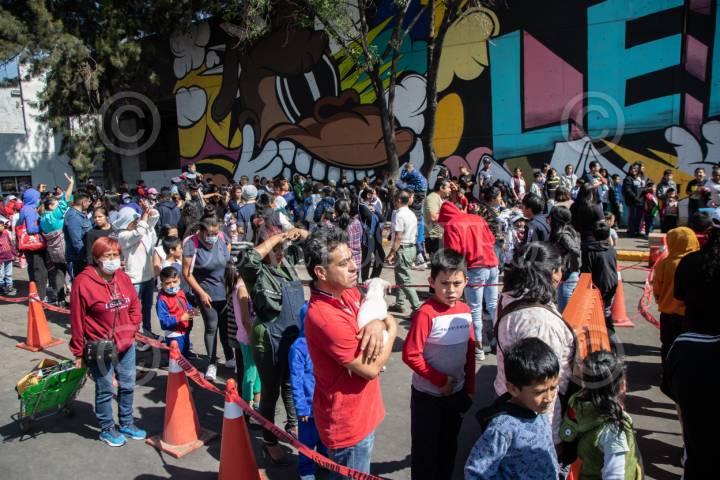 Niños junto a sus padres hacen fila durante la entregan juguetes a niños de distintas instituciones y de trabajadores de la Central de Abastos de la Ciudad de México, por los festejos de Día de Reyes.