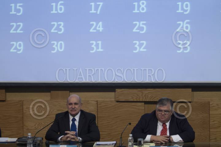 MÉXICO D.F., 09AGOSTO2013.- Eduardo Sojo Garza-Aldape, presidente del Comité de Evaluación y del Instituto Nacional de Estadística y Geografía y Agustín Carstens, Gobernador del Banco de México, durante la presentación de la lista de aspirantes a comisionados del Instituto Federal de Telecomunicaciones y la Comisión Federal de Competencia Económica, que obtuvieron las calificaciones aprobatorias más altas, en la sede del Banco de México. FOTO: MOISÉS PABLO /CUARTOSCURO.COM
