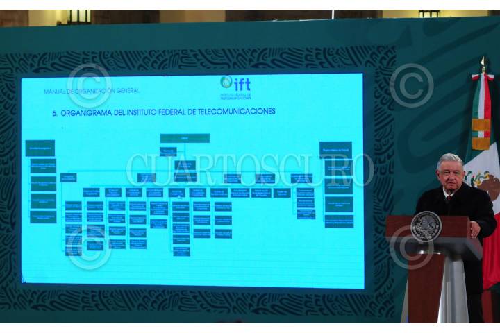 Andrés Manuel López Obrador, presidente de México, muestra el organigrama del Instituto Federal de Telecomunicaciones, durante la conferencia mañanera.