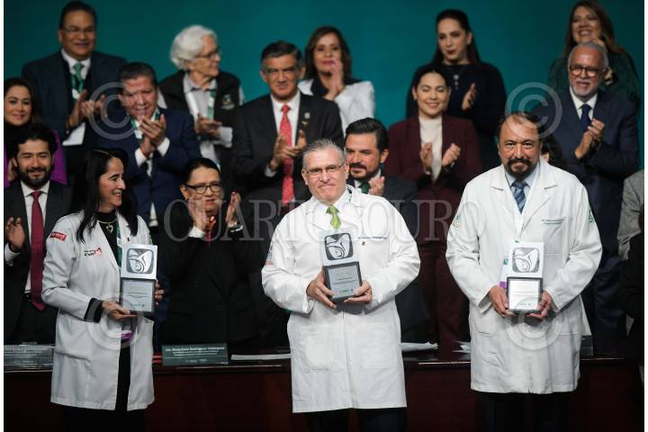 CIUDAD DE MÉXICO, 13DICIEMBRE2024.- Claudia Sheinbaum, presidenta de México, entrega un reconocimiento a la doctora Fryda Medina, por su trayectoria institucional, durante la 125 Asamblea General del Instituto Mexicano del Seguro Social (IMSS) realizada en Palacio Nacional. La acompañan: Zoé Robledo, director general del IMSS-Bienestar, y Rosa Icela Rodríguez, secretaria de Gobernación. FOTO: MARIO JASSO/CUARTOSCURO.COM