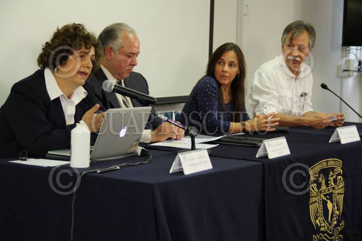 MÉXICO, D.F., 25JUNIO2015.- Una investigación de 15 años llevo a la doctora Valeria Souza Saldívar, investigadora del Instituto de Ecología de la UNAM a desarrollar una membrana capaz de detectar de manera simultánea mas de 180 bacterias, causantes principalmente de enfermedades intestinales en niños, las cuales matan a más de medio millón al año. La idea de esta membrana tan versátil no solo es atacar las enfermedades en pacientes, si no también atacar el origen de estas, que se encuentra principalmente en el agua. La empresa Encore Biotechnology compro la patente a la UNAM. Presidieron el evento: Dra. Valeria Souza Saldívar, investigadora del IE UNAM; Mtro. Juan Manuel Romero, coordinador de innovación y desarrollo de la UNAM; Dra. Ella Vázquez Domínguez, Secretaria académica del IE UNAM; Dr. Cesar Domínguez Pérez Tejada, director del IE UNAM. FOTO: ISABEL MATEOS /CUARTOSCURO.COM