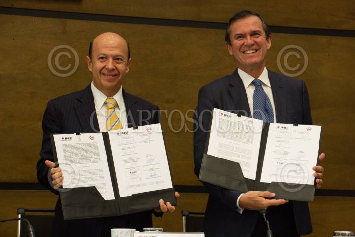 CIUDAD DE MÉXICO, 06JUNIO2019.- Enrique Andrade, Consejero Electoral del Instituto Nacional Electoral y Edmundo Jacobo Secretario Ejecutivo del Instituto Nacional Electoral, encabezaron la firma de convenio de colaboración con la organización “Iniciativa Ciudadana para la Promoción de la Cultura del Diálogo AC”, en el auditorio del instituto. FOTO: ROGELIO MORALES /CUARTOSCURO.COM