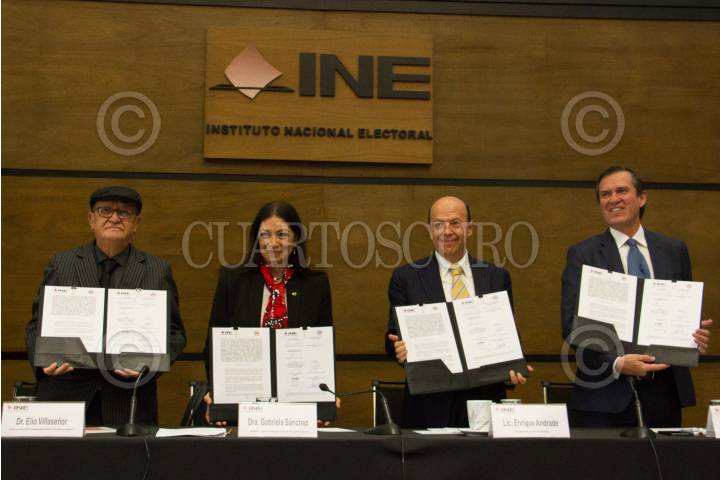 CIUDAD DE MÉXICO, 06JUNIO2019.- Elio Villaseñor, Director General en Iniciativa Ciudadana para la Promoción de la Cultura del Diálogo; Gabriela Sánchez, Presidenta de la Iniciativa Ciudadana para la Promoción de la Cultura del Diálogo; Enrique Andrade, Consejero Electoral del Instituto Nacional Electoral y Edmundo Jacobo Secretario Ejecutivo del Instituto Nacional Electoral, encabezaron la firma de convenio de colaboración con la organización “Iniciativa Ciudadana para la Promoción de la Cultura del Diálogo AC”, en el auditorio del instituto. FOTO: ROGELIO MORALES /CUARTOSCURO.COM