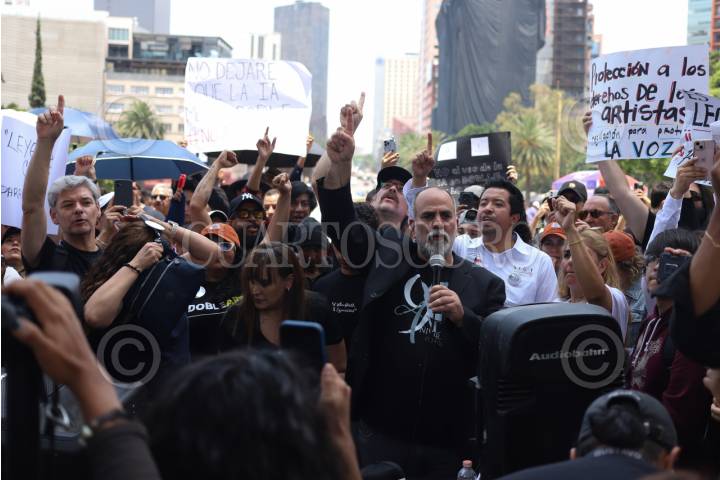 CIUDAD DE MÉXICO, 13JULIO2025.- Artistas de doblaje, locutores, productores, músicos en intérpretes se reunieron este medio día en el Monumento a la Revolución para protestar en contra del uso de la Inteligencia Artificial (IA) dentro de sus trabajos sin ninguna restricción o regularización por parte de las leyes mexicanas, argumentan que su uso afecta no solo al actor, sino también a sus familias. FOTO: DANIEL AUGUSTO/ CUARTOSCURO.COM