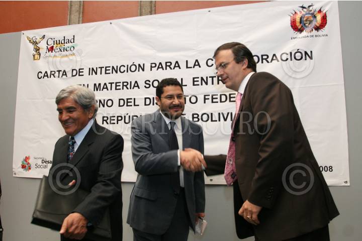 MÉXICO D.F. 11FEBRERO2008.-Marcelo Ebrad jefe de gobierno capitalino realizó la Firma de la Carta Intención para el Intercambio de Información y Colaboración en materia de Desarrollo Social con la Embajada de Bolivia.En la imege es acompañado por Jorge Mansilla Torres Embajador de Bolivia en México y Marti Batres, Secretario de Desarrollo Social del gobierno del D.F. FOTO: GUILLERMO PEREA/CUARTOSCURO.COM