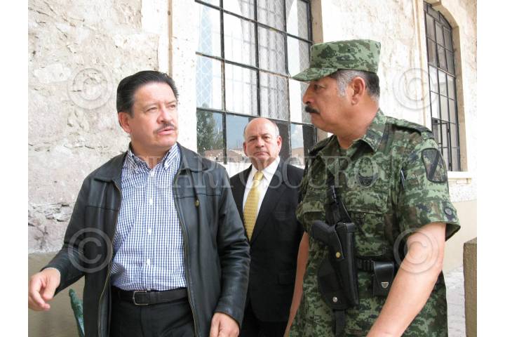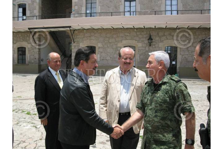 MORELIA, MICHOACAN, 19JULIO2009.- El senador Carlos Navarrete y Graco Ramirez, durante una reunión con con mandos castrenses en Michoacán, entre ellos, Rafael Ballesteros Topete, comandante de la 12 Región Militar, con la intención de evaluar su participación en los operativos que se llevan a cabo en la entidad. FOTO: CUARTOSCURO.COM