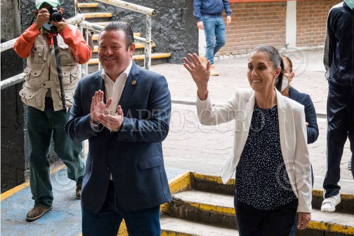 Luis Gerardo Quijano y Claudia Sheinbaum durante su llegadda para la instalación de un punto WiFi en la Secundaria Diurna No.91 en la alcaldía Magdalena Contreras