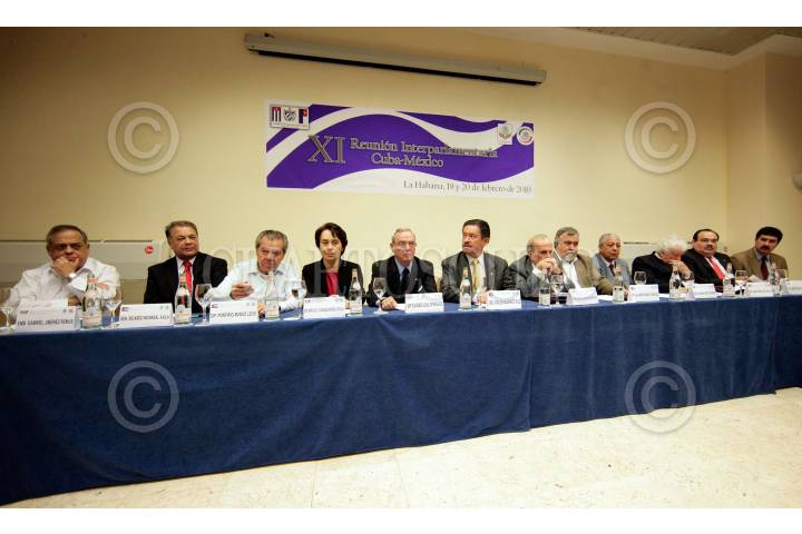 HABANA, CUBA, 19FEBRERO2010.- Gabriel Jiménez Remus, Embajador de México en Cuba, Alberto Anaya y Porfirio Muñoz Ledo, senador y diputado del Partido del Trabajo, respectivamente, María de los Ángeles Moreno Uriegas, Senadora del Partido Revolucionario Institucional, Eusebio Leal Spengler, diputado presidente del grupo parlamentario de Amistad Cuba, Carlos Navarrete, presidente del Senado de la República, Ricardo Alarcón Quezada, presidente de la Asamblea Nacional del Poder Popular de Cuba, Alejandro Encinas, diputado del PRD, durante la inauguración de la XI Reunión Interparlamentaria Cuba-México. FOTO: CUARTOSCURO.COM