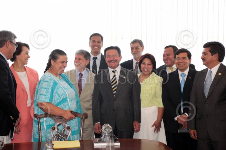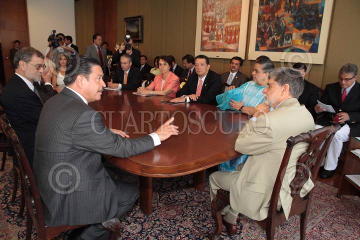 BRASILIA, BRASIL, 06MAYO2010.- Senadores y diputados federales que participaron en la II Reunión Interparlamentaria Brasil-México, se reunieron en privado con el ministro de Relaciones Exteriores de Brasil, Celso Amorim. Al concluir el encuentro el senador Carlos Navarrete Ruiz explicó que el canciller habló sobre la importancia de impulsar el intercambio bilateral y para ello, se deberá explorar cada sector. FOTO: CUARTOSCURO.COM