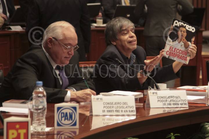 MÉXICO, D.F., 08JULIO2012.- Roberto Pérez de Alva Blanco, consejero del poder legislativo del PAN; y Jorge Herrera Martínez, consejero del poder legislativo del PT; durante la sesión extraordinaria del IFE. FOTO: IVÁN STEPHENS /CUARTOSCURO.COM