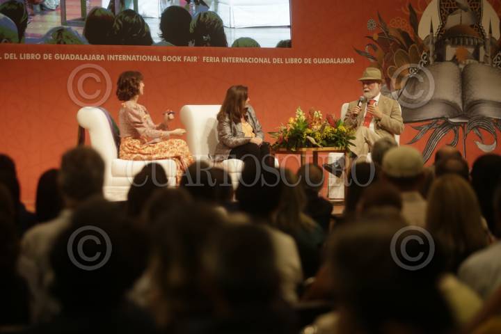 Silvia Fuentes viuda del escritor Carlos Fuentes, durante la entrega de la medalla Carlos Fuente a Alberto Manguel, esto en la edición 36 de la Feria Internacional del Libro de Guadalajara (FIL), en donde el país invitado de honor es Sharjah.