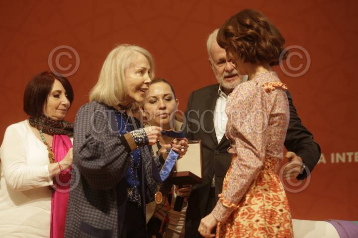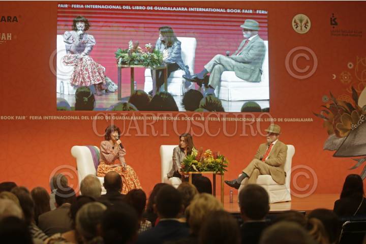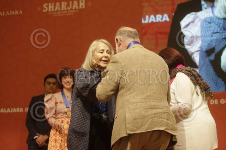 Silvia Fuentes viuda del escritor Carlos Fuentes, durante la entrega de la medalla Carlos Fuente a Irene Vallejo, esto en la edición 36 de la Feria Internacional del Libro de Guadalajara (FIL), en donde el país invitado de honor es Sharjah.