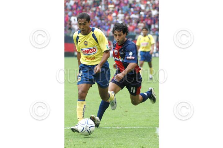 MÉXICO, D.F. Irenio Soares (América) conduce el balón ante la marca de Juan Carlos Falcón (Atlante) en el duelo de la continuaciñon de la jornada 16 del Torneo de Clausura 2006 en el que los Potros de Hierro del Atlante vencieron un gol a cero a las águilas del américa. FOTO: Iván Stephens/CUARTOSCURO.COM