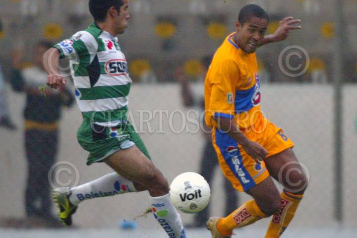 TORREON, COAHUILA14NOVIEMBRE2004.- Irenio Soarez de Tigres envia un centro mientras es marcado por Jorge Campos de Santos en el juego de la jornada 16 en el estadio Corona. FOTO: Jorge López/CUARTOSCURO.COM