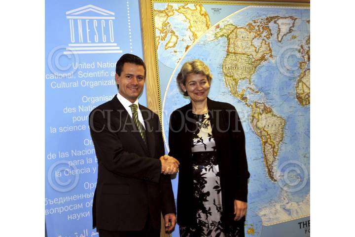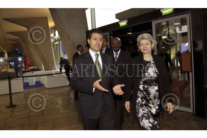 PARIS, FRANCIA, 18OCTUBRE2012.- Enrique Peña Nieto, presidente electo de México, se reunió esta mañana con Irina Bokova, Directora General de la UNESCO, con quien sostuvo una plática privada y un recorrido por la sede de este organismo. FOTO: CUARTOSCURO.COM