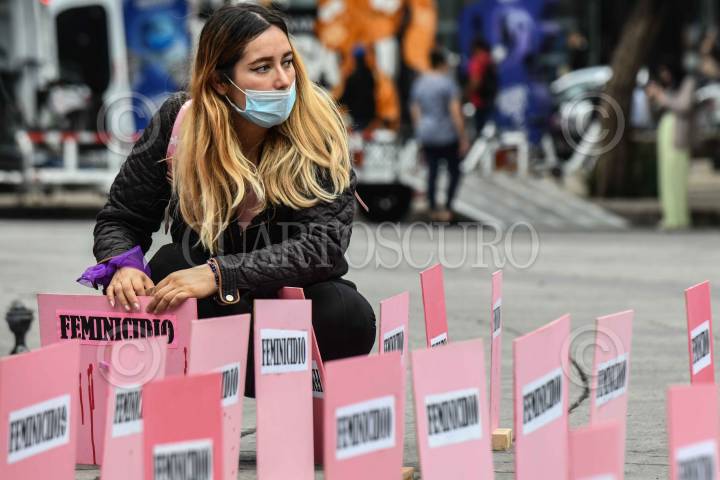 CIUDAD DE MÉXICO, 27JUNIO2024.- Una mujer coloca letreros con la palabra "feminicidio", durante el acto simbólico en las inmediaciones del Ángel de la Independencia por el 14 aniversario luctuoso de Mariana Lima Buendía. FOTO: MARIO JASSO/CUARTOSCURO.COM