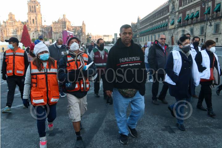 Irineo Mújica, líder de la caravana migrante proveniente de Tapachula, Chiapas, acompañado de Nashielli Ramírez, secretaria de la Comisión de Derechos Humanos de la Ciudad de México, salió de Palacio Nacional después de una reunión con funcionarios para pedir un libre tránsito del país
