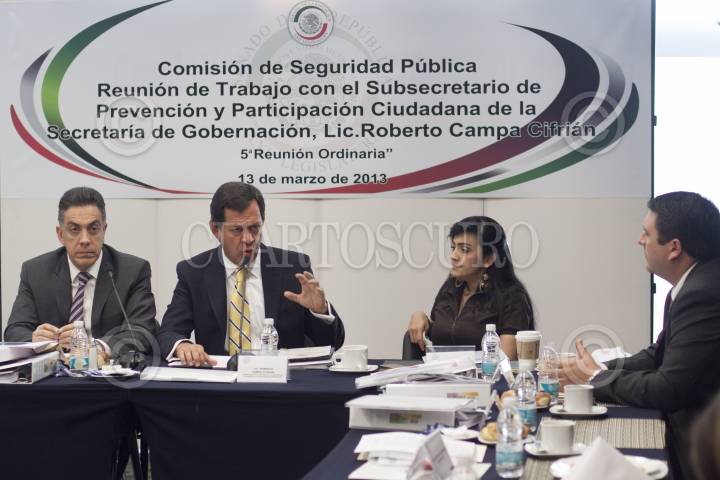 MÉXICO, D.F., 13MARZO2013.- Omar Fayad, senador del PRI, Roberto Campa Cifrián, subsecretario de Prevención y Participación Ciudadana de la Secretaría de Gobernación, y Iris Vianey Mendoza, senador del PRD, durante una reunión con la comisión de Seguridad Pública del Senado de la República. FOTO: MOISÉS PABLO /CUARTOSCURO.COM