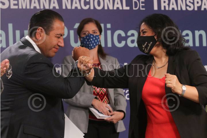 Eduardo Ramírez, presidente de la mesa directiva en el Senado, e Irma Eréndira Sandoval, secretaria de la Función Pública, se saludaron de codo durante la inauguración de la Semana de la Transparencia 2020